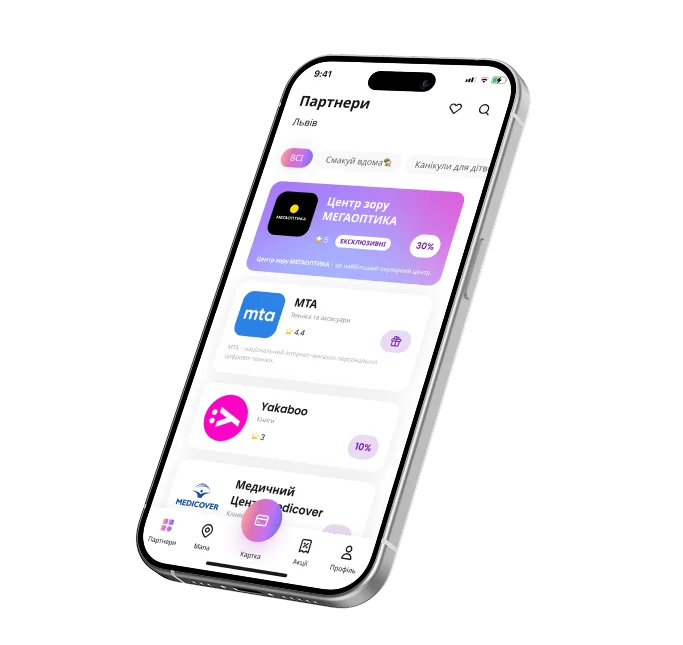 Отримуй знижки та подарунки від 1000+ брендів-партнерів із 70+ категорій: кафе, ресторани, товари для дому, здоров’я, спорт, розвиток, освіта тощо. Всі знижки шукай у застосунку.
